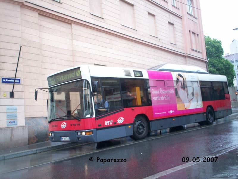 Heute konnte ich, wenn auch leider bei etwas schlechterem Wetter den Bus NR.8917 mit Trafficboard am 13A beim Haus des Meeres fotgrafieren. Dieser Bus ist erst seit kurzem in der Garage Raxstraße beheimatet und ist ursprünglich auf den Linien der Garage Vorgarten zum Einsatz gekommen. Durch die Umstationierung einiger NL 243 musste die Garage Vorgarten einige NL 205 an die Garage Raxstraße abgeben. So kommt es nun, dass heute einige ehemalige "Vorgartler" am 13A ihre Runden gedreht haben.