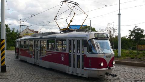 T3R.PLF 8259 zieht T3R.P 8564, sie biegen aus der Sokolovska in Richtung der Station Palmovka
