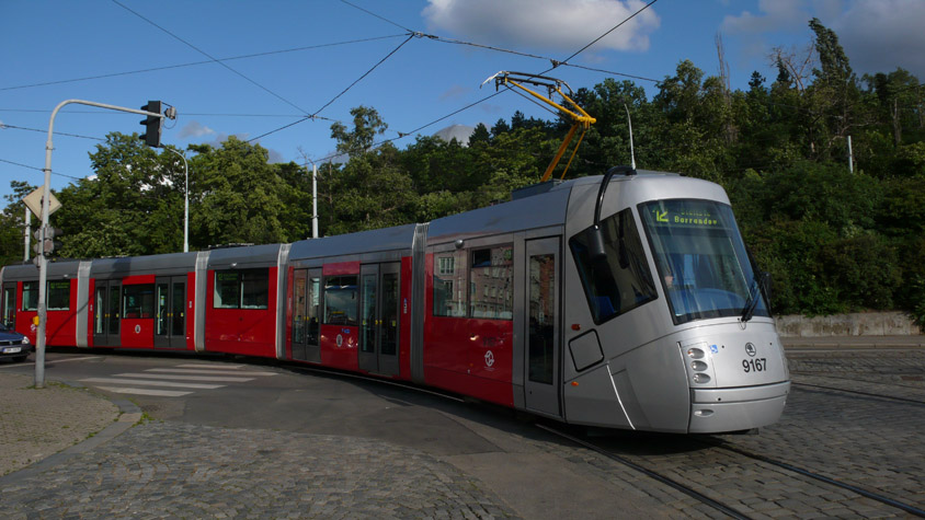 14T 9167 biegt zur Sation Palmovka. Besonders gelungen finde ich diese Skoda-Tram nicht...