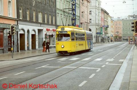 Ein Lohnerwagen (TW 72) und ein ex-Bielefelder (TW 35) als Linie 3 bzw. 1 in der feiertäglich-leeren Musemstraße.