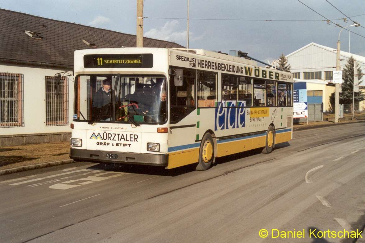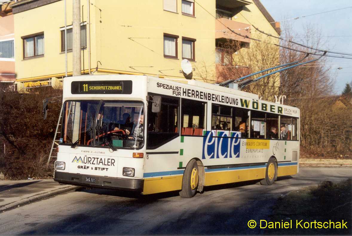 Bild 1: Obus 15 (G&S/ Kiepe, 1985) in der Schleife Schirmitzbühel. Bild 2: vor dem Aufdrahten vor dem Werk VI
