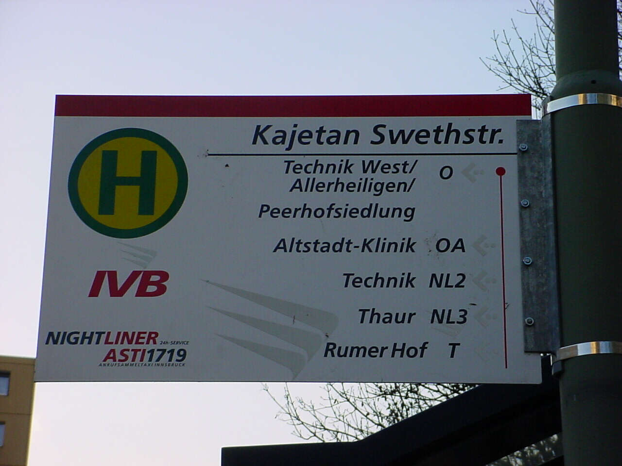 Haltestelle Kajetan-Sweth-Straße. Man beachte die falsche Schreibweise des Straßennamens. Leider sind sehr viele Haltestellen falsch beschildert, teilweise sogar mit unterschiedlichen Fehlern an ein und derselben Haltestelle (Name am Schild anders als am Wartehäuschen und am Fahrplan).