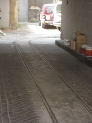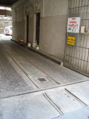 Als ich am Samstag die alten Gleise in der rechten Wienzeile fotografieren war, bin ich durch Zufall auch durch die Kettenbrückengasse gekommen. In einer Toreinfahrt zwischen Nummer 19 und Nummer 21 liegt noch dieses Schmalspurgleis, das außen direkt am Tor endet. Im Hof macht es hinten eine Rechtsbiegung.