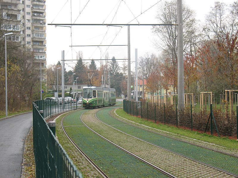 1. Ein kleiner Sprung nach Osten: nach der Haltestelle Eisteichgasse führt die Strecke auf einem begrünten Gleiskörper an der Terrassenhaussiedlung vorbei...