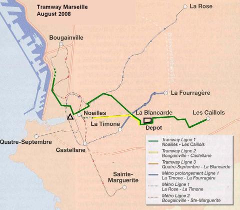 Depot; grün hingegen die Linie 1 zwischen (derzeit) Euromed./Gantes durch