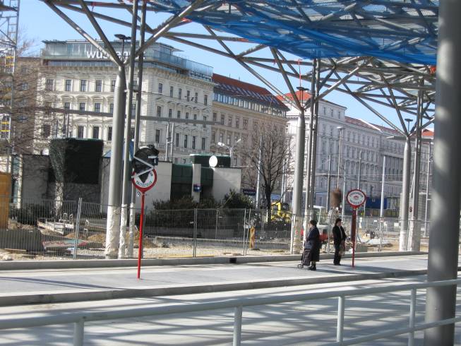 Der Umbau des Pratersterns ist noch lange nicht fertig, aber immerhin können die Linien 5 und O schon die neue Schleife befahren. Die Haltestelle der Linie 80A ist hingegen noch an den provisorischen Stellen;
