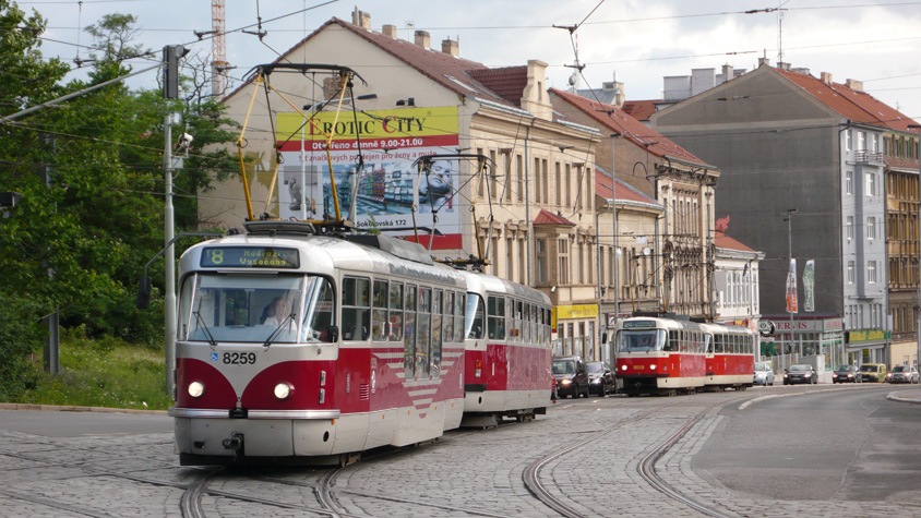 T3R.PLF 8259 zieht T3R.P 8564, sie biegen aus der Sokolovska in Richtung der Station Palmovka
