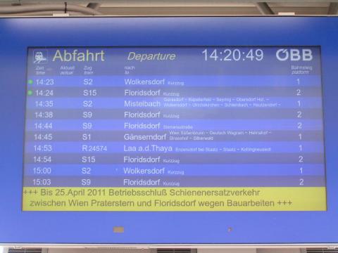In Leopoldau angekommen den (nicht gerade prominent plazierten) Baustellen-Zusatzfahrplan gefunden, der den 14h25 aber nur für DO 21. und FR 22.4. ankündigt, aber nicht heute SO 24.4. - auch der Bildschirm am Bahnsteig kündigt den Zug nicht an. Bilder beigefügt, Fahrplan leider kaum lesbar, habe zu sehr an der Auflösung gespart :-(