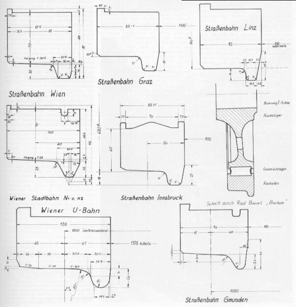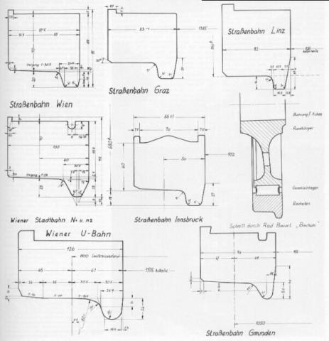 Straßenbahnbetrieben ca. 1975 in Verwendung stehenden Radreifenprofile