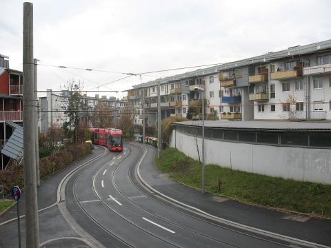 1. Ein kleiner Sprung nach Osten: nach der Haltestelle Eisteichgasse führt die Strecke auf einem begrünten Gleiskörper an der Terrassenhaussiedlung vorbei...