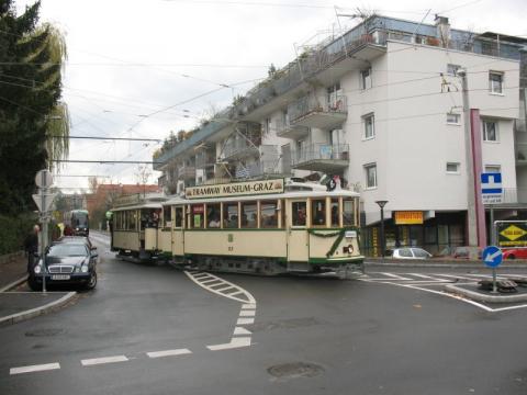 1. Den Breitenweg entlang führt die Strecke zur Peterstalstraße. Am Foto verlässt die 2. Oldtimer-Garnitur, die an diesem Tag unterwegs war, die Haltestelle "Prof.-Franz-Spath-Ring" (= die Adresse der Wienerberger-Siedlung) und biegt in die Peterstalstraße ein.