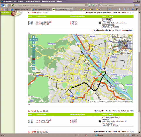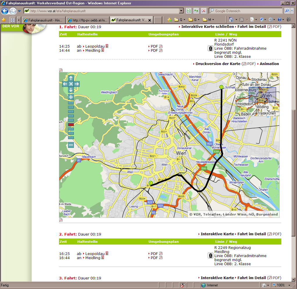 und mich für den 14h25 entschieden. Quercheck mit dem VOR Fahrplan erfolgreich (ebenso beigefügt) - als besonderes Goodie ist die Streckenführung zwischen Leopoldau und kurz nach Stadlau hervorzuheben.