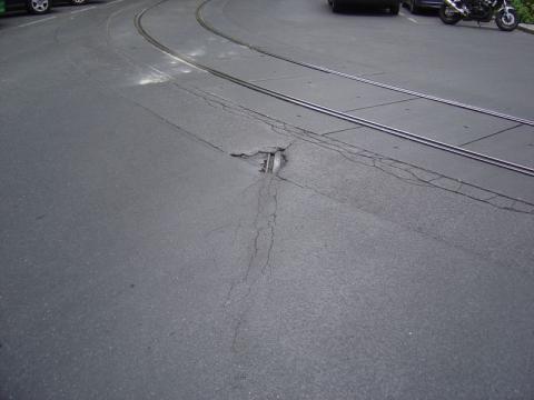 > Hohenstauffergasse ist ein (tiefes) Schlagloch, aus dem ein Gleisrest