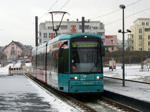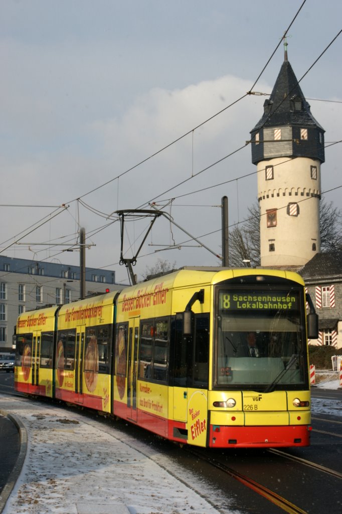 Zum Fahrplanwechsel im vergangenen Dezember wurde im Frankfurter Norden die Straßenbahn-Neubaustrecken nach Preungesheim eröffnet. Sie zweigt im Nordend von der Linie 12 ab und verläuft dann großteils in der Mitte der breiten und unglaublich hässlichen Friedberger Landstraße, das letzte Stück führt dann durch eine Kleingartensiedlung und entlang der A661 bis in das nicht minder hässliche neue Wohngebiet Preungesheim Ost. Die Endstation Gravensteiner Platz ist als zweigleisige Stumpfendstelle ausgeführt. Das einzige nette Fotomotiv ist die Friedberger Warte, die inmitten des Verkehrsgetöses auf einer kleinen grünen Insel ihr Dasein fristet und als Restaurant und Weinschänke genützt wird.