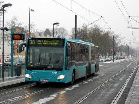 Die Straßenbahntrasse in der Friedberger Landstraße wird auch von Buslinien mitbenützt. Zur HVZ verstärkt die nach Bad Vilbel weiterfahrende Linie 30 die Straßenbahn auf einen Fünf-Minuten-Takt, sonst muss an der Friedberger Warte ungestiegen werden.