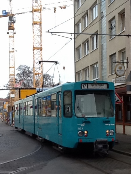 Eingesetzt war der Pt heute auf der Linie 19, die lediglich aus zwei morgendlichen und mittäglichen Schülerkursen besteht. Dass die Brosebänder 17 anzeigen, ist entweder der Faulheit des Fahrers oder dem Umstand, dass die 19 nicht vorhanden ist, geschuldet. Es ist jedenfalls ein typisches Beispiel dafür, dass man auch bei der Frankfurter Straßenbahn gerne nach dem bei den Wiener Linien beliebten Motto "Weil's wurscht is..." handelt und zeigt, dass die Straßenbahn (die man noch Mitte der 90er nahezu komplett stillegen wollte) in Frankfurt noch immer ein ziemlich ungeliebtes Kind ist.