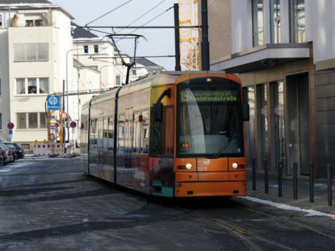 Auf der Straße herrscht normaler Fahrzeugverkehr, Warntafeln weisen auf den "Rangierbetrieb" der Straßenbahn hin, trotzdem sind vor allem Pkw-Lenker mit den in Frankfurt "beliebten" Umland-Kürzeln OF, MKK, MTK, GG etc. oft total überfordert, wenn die Straßenbahn plötzlich losfährt und dann auch noch die Straßenseite wechselt.
