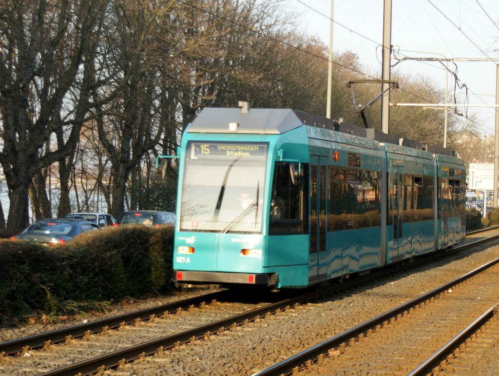 Anbei einige Schnappschüsse, die am Niederräder Ufer nahe der Uniklinik entstanden sind, wo die Straßenbahn auf eigenem Gleiskörper an den sich stauenden automobilen Pendlern und Stadionbesuchern vorbeisaust.