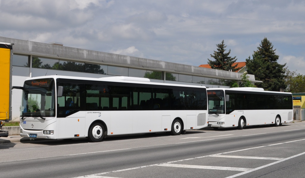 Zwei Fotos zeigen die ersten Busse bei der Überstellungsfahrt von Wöllersdorf bei Wr. Neustadt (Sitz der Fa. Iveco)