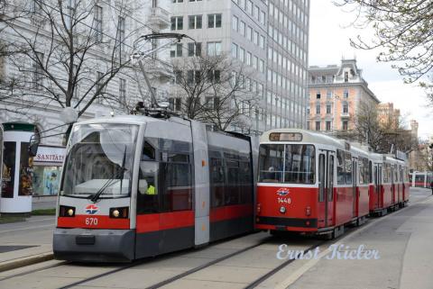 Bild 2 zeigt den Zug E2 4064 + c5 1435 beim Abbiegen in den Schottenring.