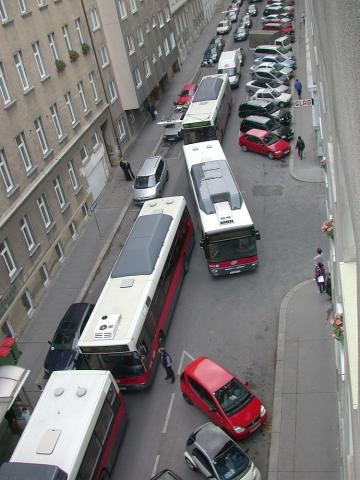 erkleckliche Menge weiterer Busse in unserer armen Gasse zusammengeschoppt,