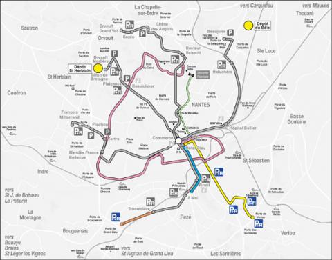 Nantes hat seit 1985 ein Straßenbahnnetz von drei Linien aufgebaut.
