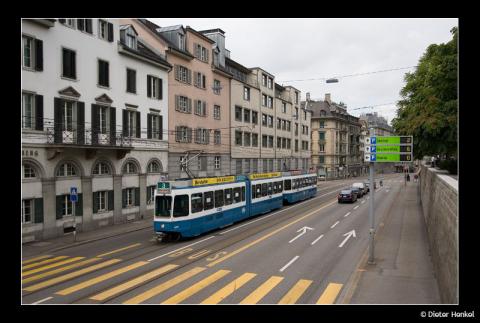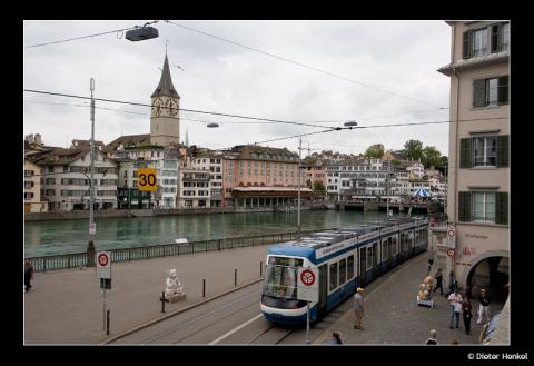 Straßenbahngarnitur erkennen kann, die am Ufer der Limmat ihren Weg