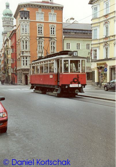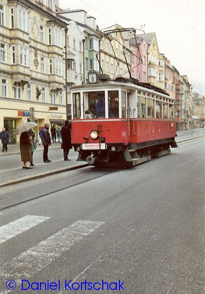 Triebwagen 3 der Tiroler Museumsbahnen anlässlich einer bestellten (Oster-)Sonderfahrt in der Maria Theresien-Straße.