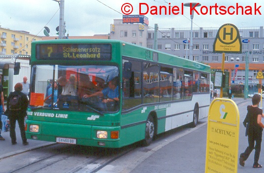 Foto zeigt den Bus in der Haltestelle Jakominiplatz. Das zweite und dritte