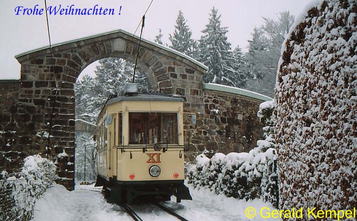 Das Weihnachtsfoto zeigt den Triebwagen XI der Pöstlingbergbahn