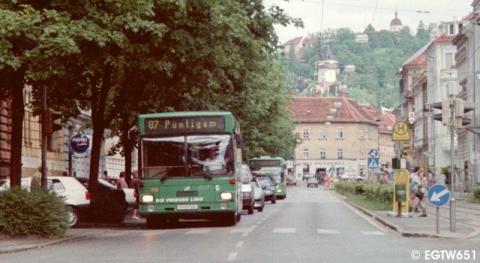 Hier ist ein Foto des Bus Nr. 59 (ex Salzburg) in der Conrad von Höttzendorfstraße mit "87 Puntigam" beschriftet.