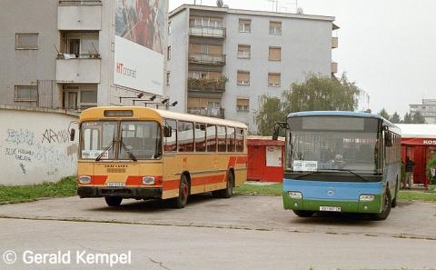 in Karlovac. Daneben ist ein neuer Mercedes O 345 Connecto aus