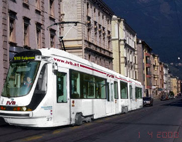 Aufgrund des größeren Lichtraum-Profils dieser Wagen ragt der Rückspiegel links über das Gegengleis und ist daher mit einer Automatik ausgerüstet, die ihn im Fall des Herannahens eines Gegenzugs blitzschnell nach innen klappt. Leider befindet sich das Fahrzeug nicht mehr im Besitz der IVB. Daher gibt es auch nur dieses eine Bild. Es wurde damals vom Fahrer, dersich schnell ein Döner holen wollte, in der Innenstadt kurz abgestellt und daraufhin prompt aufgebrochen und gestohlen. Die Innsbrucker Kriminalpolizei, SOKO Tramdiebstähle, vermutet, daß eine Bande polnischer Fahrzeugdiebe dafür verantwortlich zu machen ist, die den millionenteuren Wagen in einer osteuropäischen Stadt bereits umgespritzt und auf dem Straßenbahnschwarzmarkt zu Bargeld gemacht haben dürfte; dafür spricht auch das vermehrte Auftreten von Cityrunnern etwa in Lodz.