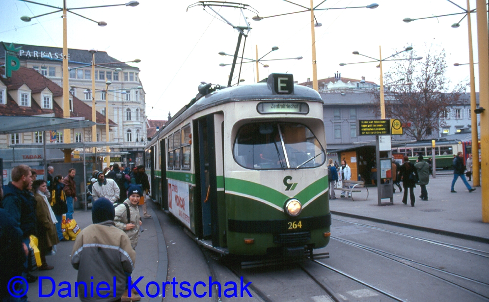 Das erste Bild zeigt Wagen 264 am Jakominiplatz. Das Zielschild stammt von