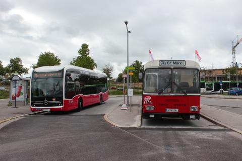 In Schwechat war außerdem etwas Zeit für "Spielerei" mit meiner Lieblingsart von Zielanzeigen, währenddessen gesellte sich ein eCitaro (Wagen 8408, ehemals ein LU200M11) dazu. Beachtet man noch den MAN 12C im Hintergrund, wirkt es, als wäre der Bus 40 Jahre durch die Zeit gereist.