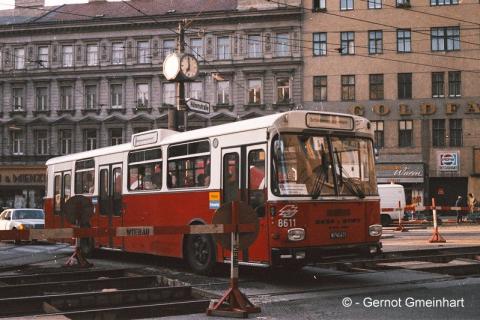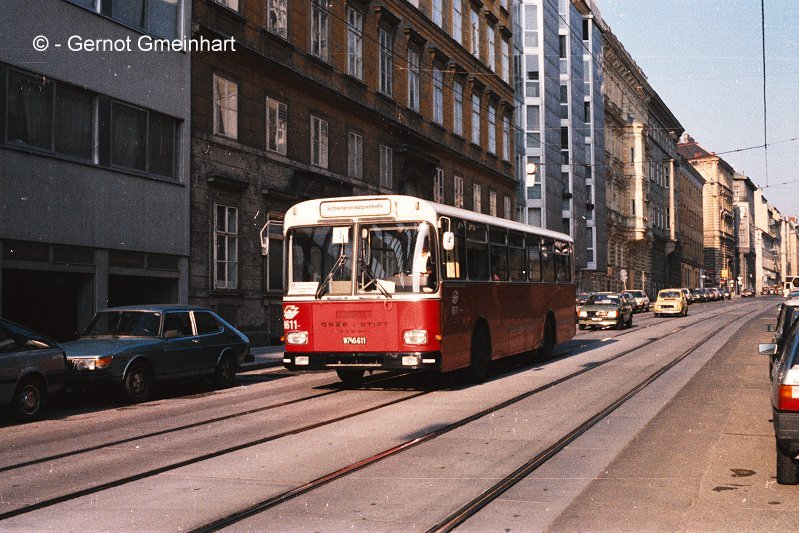 Gerne komme ich dem Wunsch nach, Fotos vom 8611 in die Fotokiste zu stellen. Die Fotos entstanden am Samstag, 2. August 1985, als der 5er, 37er und 38er wegen einer Baustelle im Schienenersatzverkehr fuhren. Die Kreuzungsweiche Alserbachstraße - Nußdorferstraße wurde ausgetauscht und der 5er am Wochenende zweigeteilt geführt. Teil 1 Praterstern - Stadtbahn Nußdorfer Straße mit Straßenbahn (E) und Teil2 Alserbachstraße - Stadtbahn Josefstädter Straße mit Schienenersatzverkehr (LU). Auch der erste Samstags-31/5 fuhr übrigens mit einem E1 zur Nußdorfer Straße.