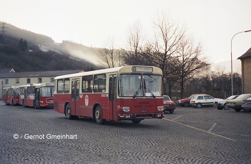 Leoben 23 in der Garage Kärntnerstraße (23.01.1990). Ein Zweitürer der Type GSL-200 M 10. Ich war sehr gerne und oft in Leoben. Vorallem die Gelenkbusse aus den 60er-Jahren haben es mir angetan...