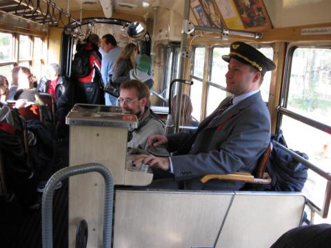 Einer der Schaffner geht vor und fragt den Fahrer, warum er nicht weiterfahre.