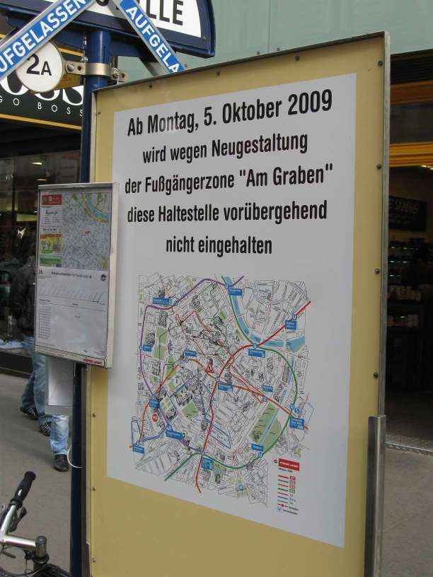 "Ab Montag, 5. Oktober 2009 wird UNABHÄNGIG von der Neugestaltung der Fußgängerzone Am Graben diese Haltestelle vorübergehend einfach nicht eingehalten, um auf dem Rücken der Fahrgäste zu sparen." (SCNR)