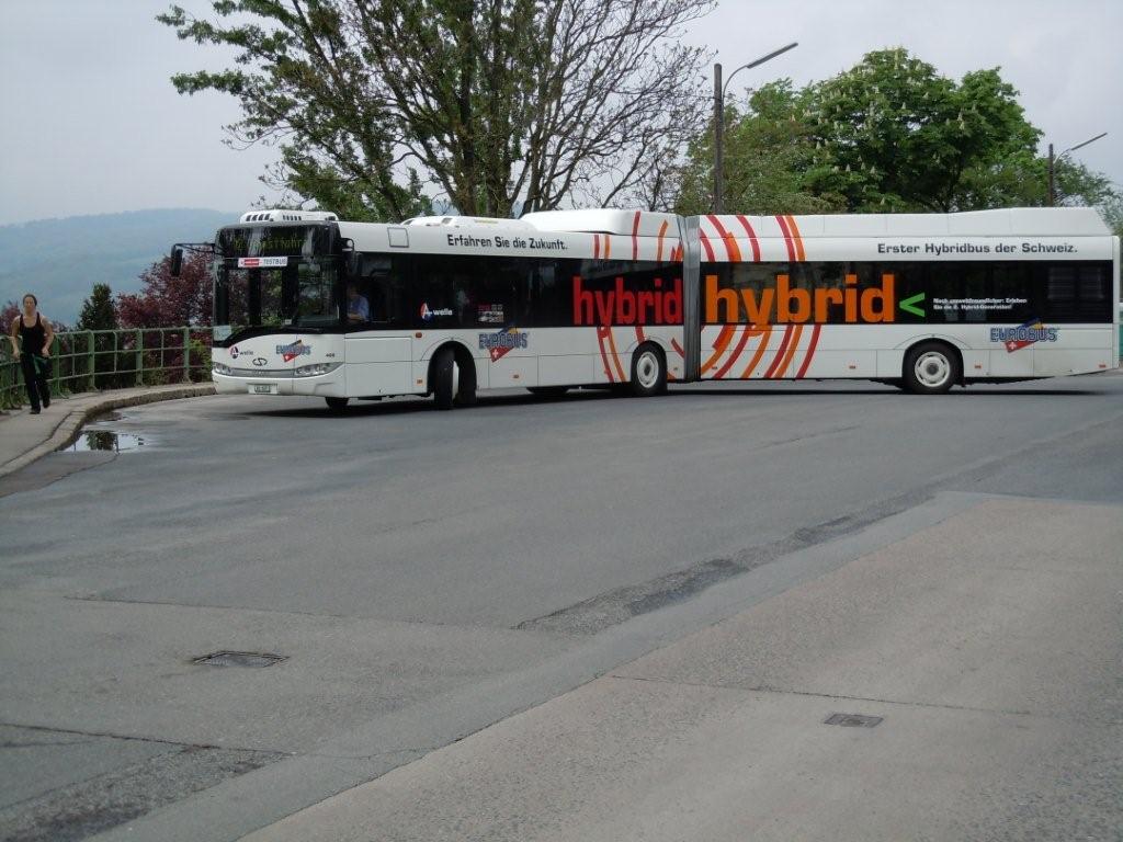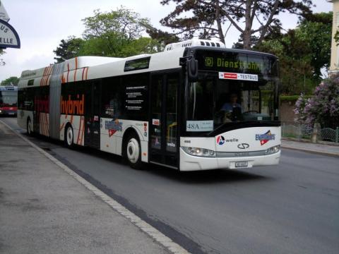 Heute, 4.5.2010, kam am 48A ein Testbus des Herstellers Solaris zum Einsatz. Es handelt sich hierbei um einen Hybridgelenksbus mit Schweizer Kennzeichen. Die letzten beiden Türen sind Schwenktüren und bei den Fahrsitzen sind Gurte montiert. Der Bus fuhr mit der Aufschrift "Dienstfahrt": viele Fahrgäste trauten dem nicht, und warteten lieber auf den nächsten Bus.