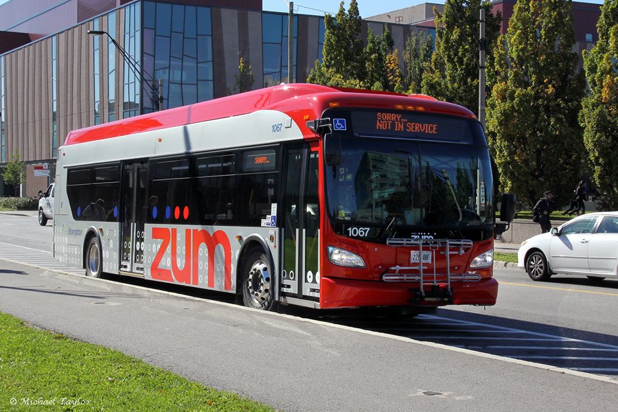 1067 is a Brampton Transit New Flyer XDE40 hybrid low floor from 2010, painted in ZÜM limited stop livery. The word didn't translate from German using Google Translate so it would appear to be a fabricated word to envision speed and zooming.