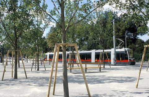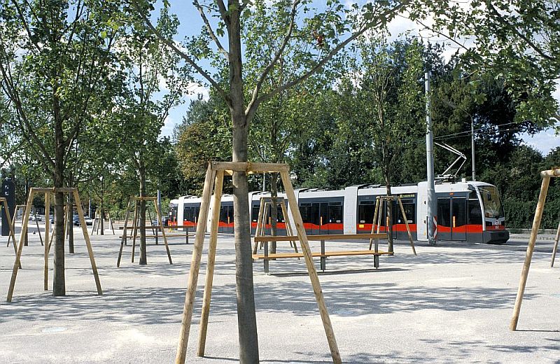 Bäumchen ist schon wieder hinter einem Bauzaun verschwunden, der Brunnen