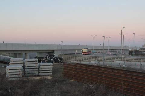 mit U-Bahntrasse und einer Station aus Glas und Stahl.