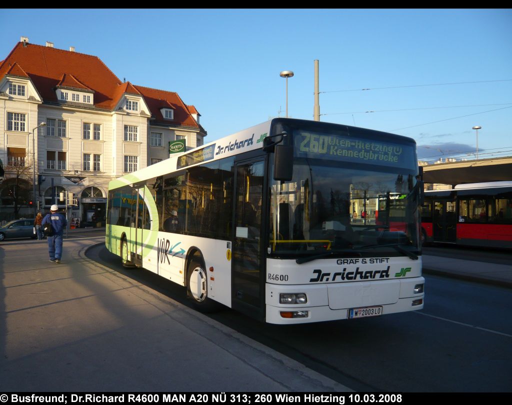 Das erste Foto zeigt einen MAN A20 NÜ 313 (R4600) auf der Linie 260 in der leider mittlerweile aufgelassenen Endstation Wien-Hietzing. Zum Zeitpunkt dieses Fotos, war dieser Buseinsatz bereits eine Rarität und nur mehr äußerst selten zu beobachten. Die Busse wurden durch MAN A21 NL 313 bzw. Lions City ersetzt.