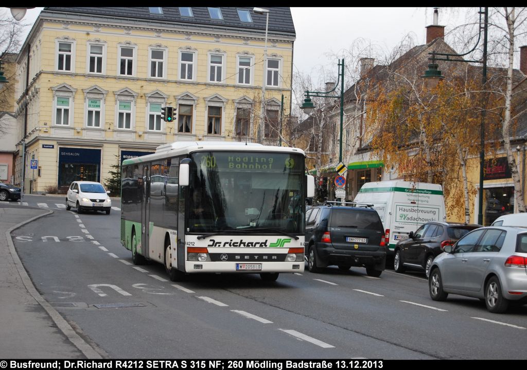 Das letzte Foto meines Dr.Richard Rückblicks entstand am vorletzten Betriebstag, vor der Neuübernahme der Ausschreibungslose, mit einem besonderen Bus. Hier kam ein SETRA S 315NF (R4212) auf der Linie 260 zum Einsatz. Rückblickend kann ich mich gerade mal an eine Hand voll Einsätze, dieser Bustype, auf dieser Linie, erinnern.