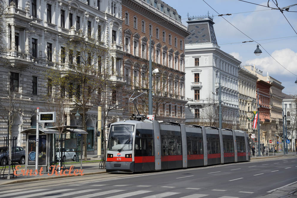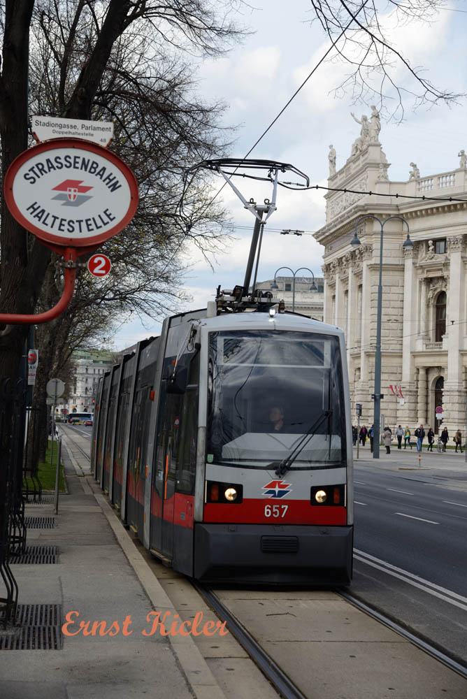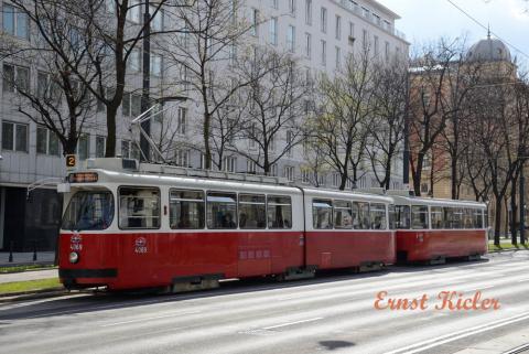 Bild 2 zeigt den Zug E2 4064 + c5 1435 beim Abbiegen in den Schottenring.