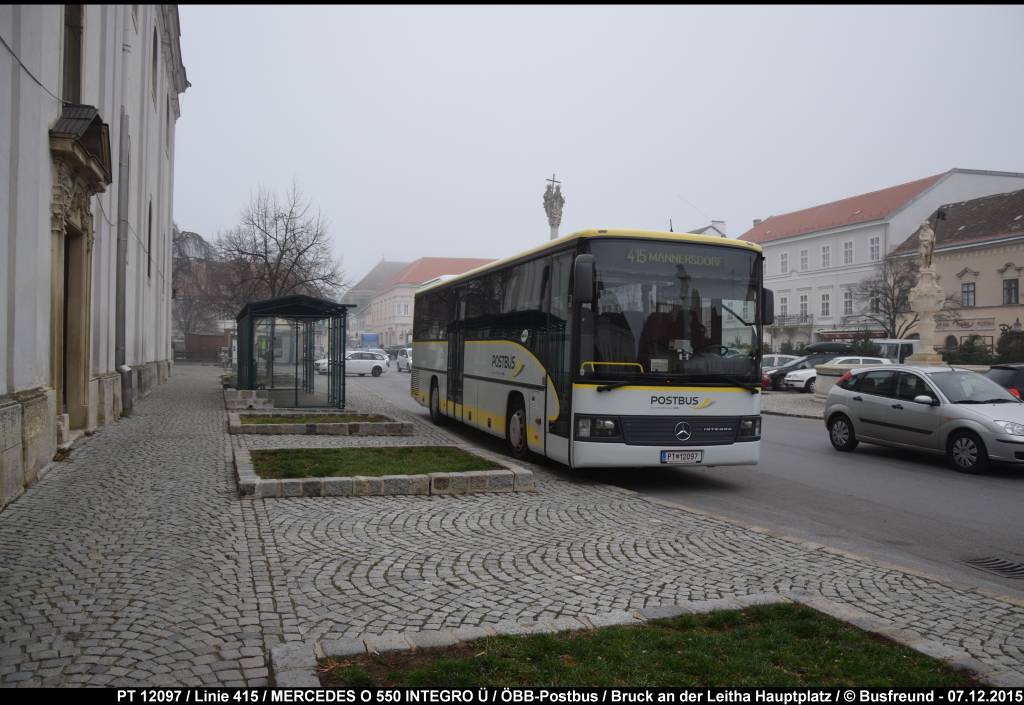Foto 2 zeigt einen MERCEDES O 550 INTEGRO Ü in alter Post.Bus Farbgebung am Hauptplatz in Bruck/Leitha