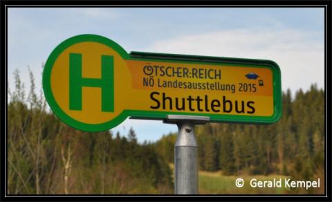 - Haltestellentafel des Shuttlebusses des NÖ Landesausstellung 2015 "Ötscherreich" bei der