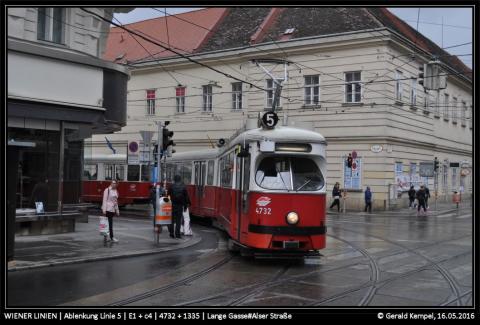 -E1+c4 4732+1335 auf der Linie 5 biegen mit umgeklapptem Zielschild von der Lange Gasse in die Alser Straße ein
