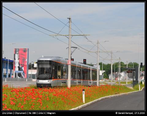 - Auch die Haltestelle Wagram ist von großen Mohnblumenfeldern umgeben. Zu sehen ist CR2 Nr. 080